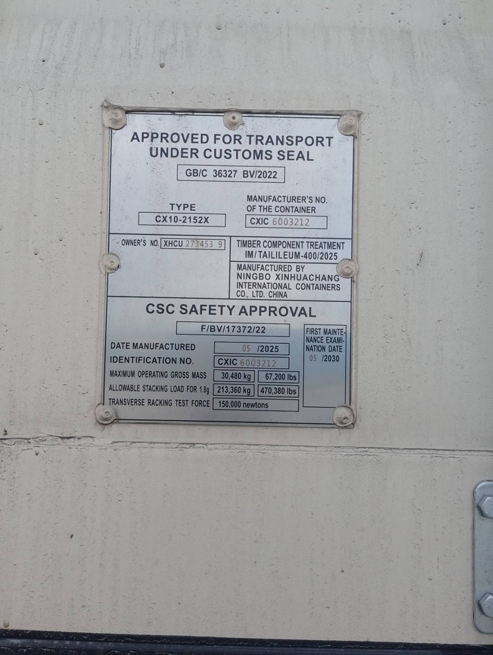 • Numéro d’identification : XHCU 273453 9