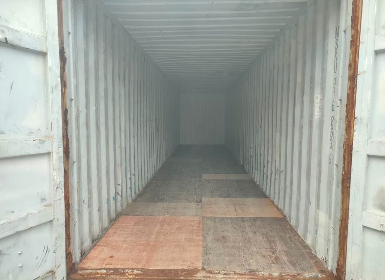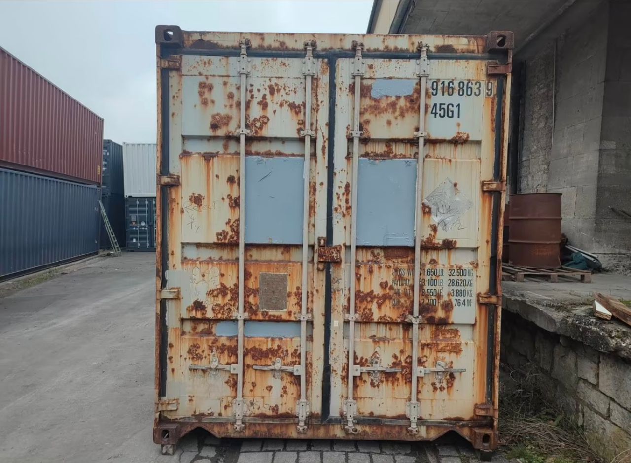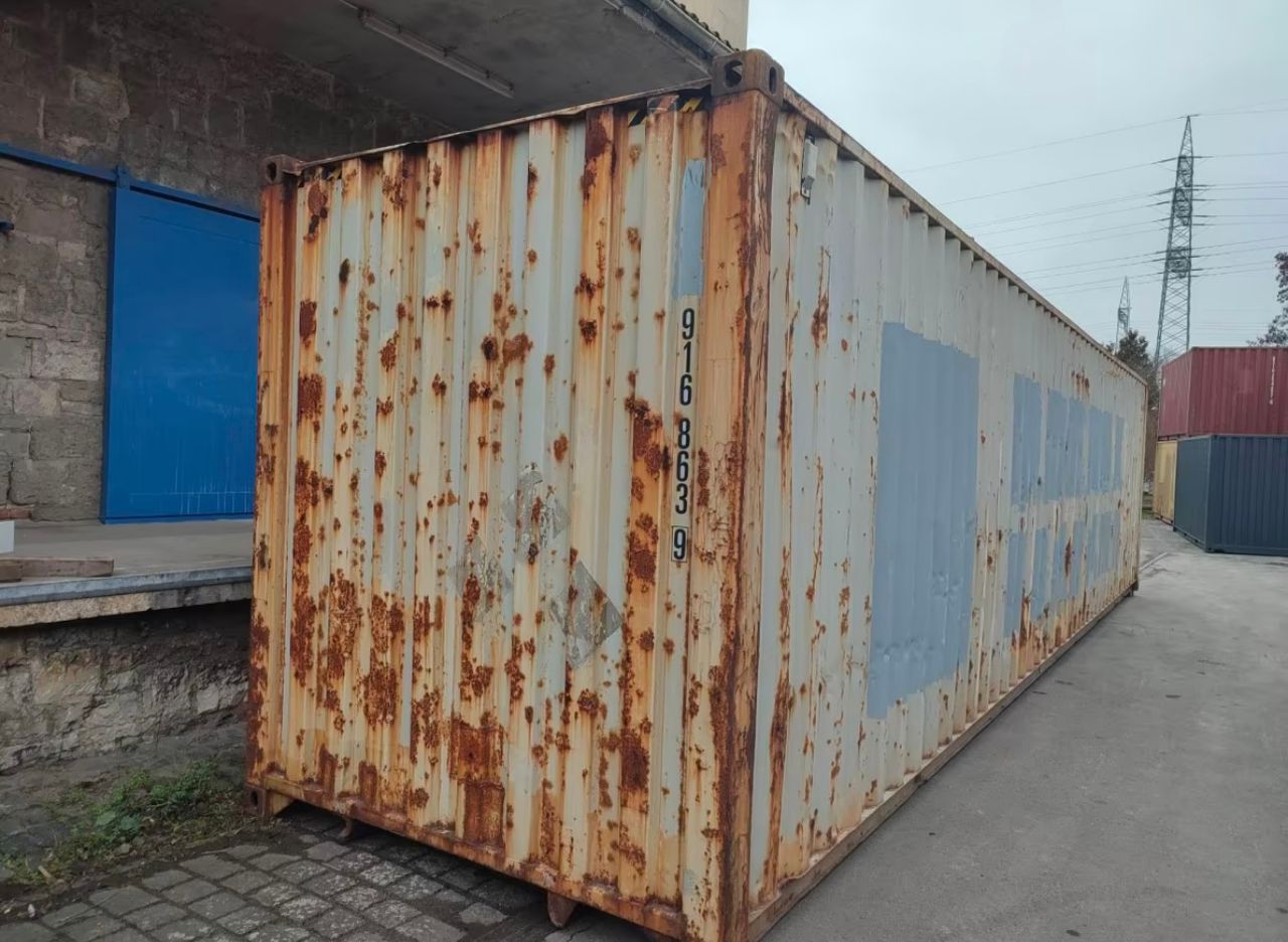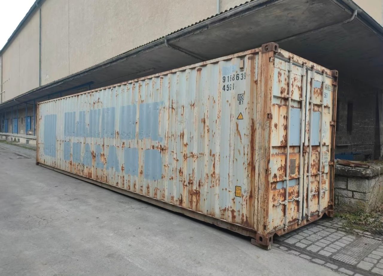 Conteneur 40 pieds High Cube (Type 45G1) d’occasion, vendu dans l’état (AS IS). Offre un volume XXL de 76,4 $m^3$ avec une hauteur accrue. Structure saine en acier Corten présentant de la corrosion superficielle. Idéal pour petit budget : stockage de chantier, garage, ou base de transformation après rénovation.